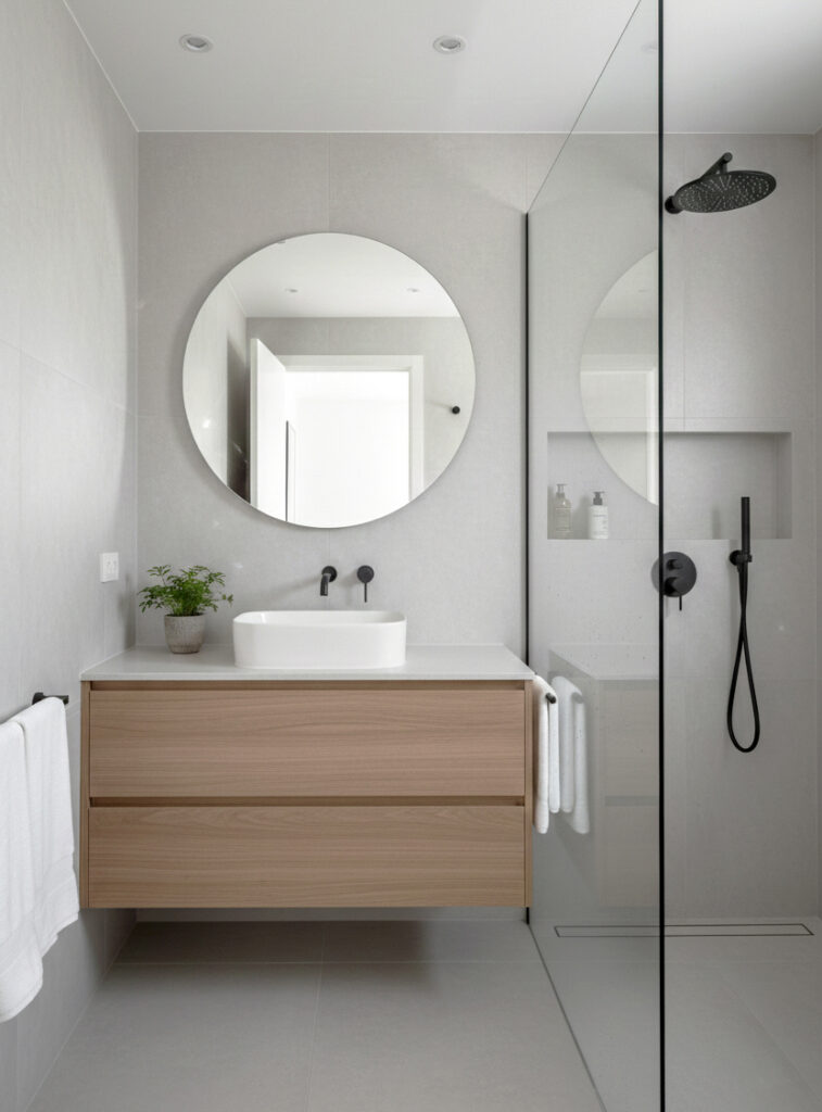 2. El espejo como ventana: Un espejo circular de gran formato no es solo para mirarse. Al reflejar la pared opuesta y la luz de los focos empotrados, duplica visualmente la profundidad del baño. Es el truco más antiguo y efectivo del manual del arquitecto.