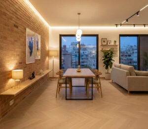 El equilibrio entre materiales naturales y líneas puras amplía visualmente el espacio.