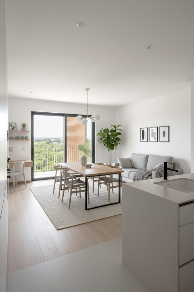 Al unificar el comedor y el salón, permitimos que la ventilación cruzada y la luz inunden toda la planta. La mesa de madera maciza y las sillas de fibras naturales actúan como puntos de anclaje que aportan calidez, mientras que la iluminación técnica (focos empotrados y una lámpara suspendida de diseño) permite crear diferentes escenas según el momento del día.