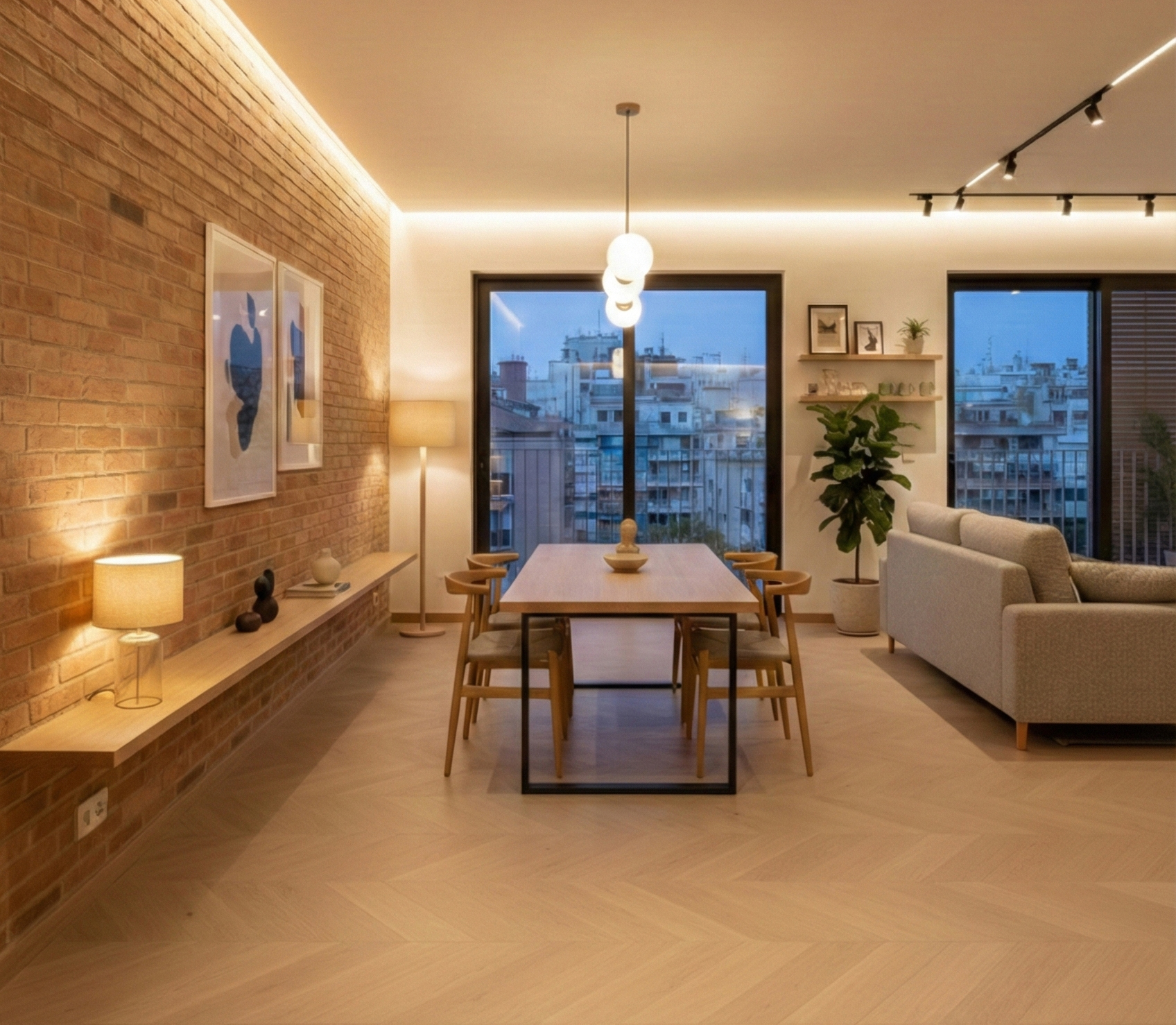 Una buena iluminación no consiste en llenarlo todo de luz. Consiste en crear capas, profundidades y sombras controladas. Tu casa no necesita la misma luz para limpiar un sábado por la mañana que para disfrutar de una cena íntima o ver una película.